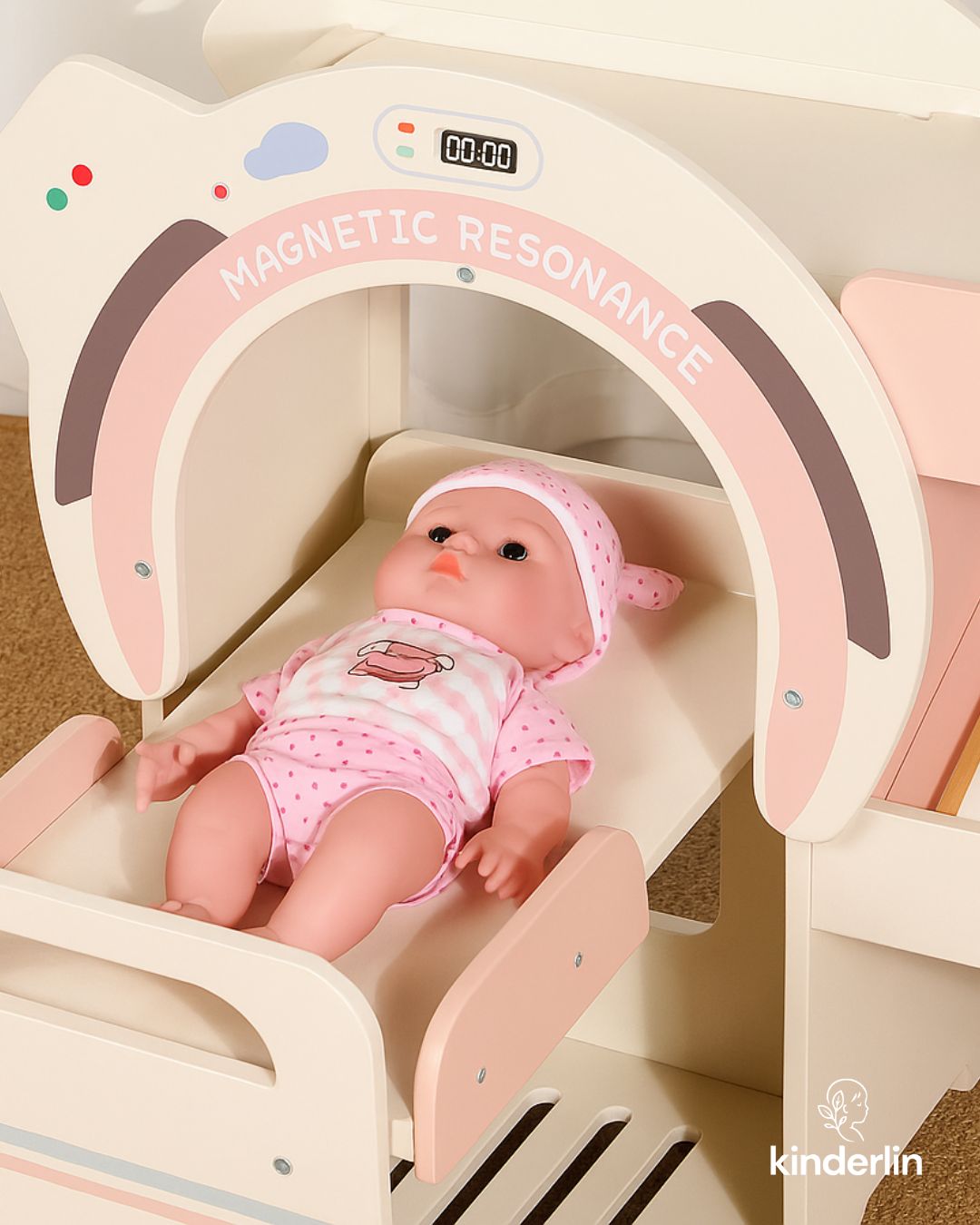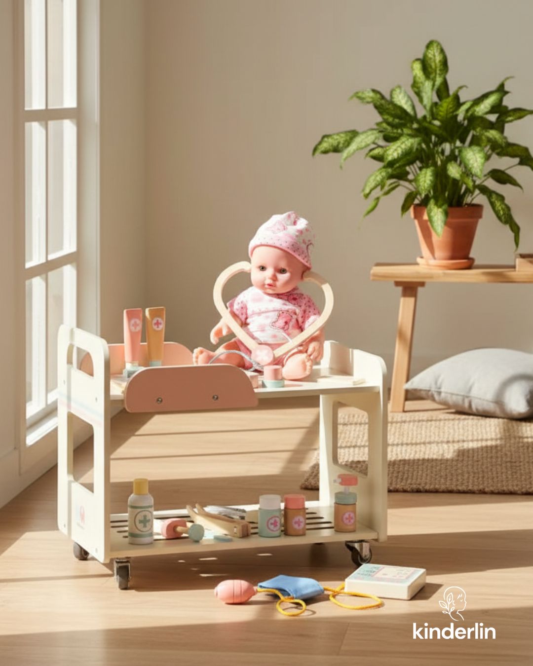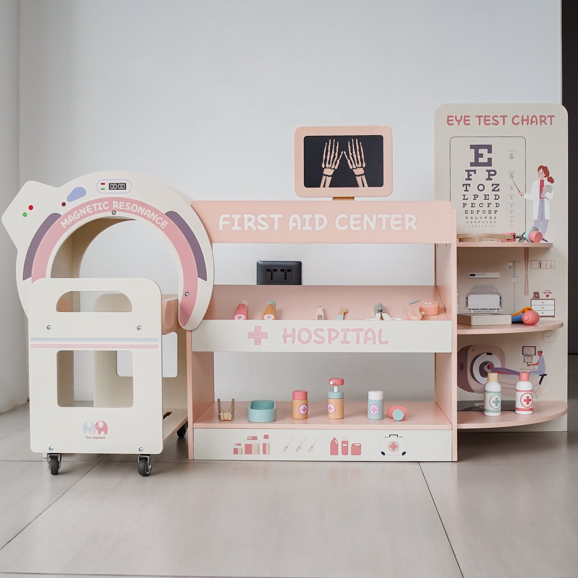 Thoughtfully designed for nurturing young minds, the Little Healer’s Hospital brings the world of gentle care and empathy to playtime. Crafted from solid wood with non-toxic, water-based finish.