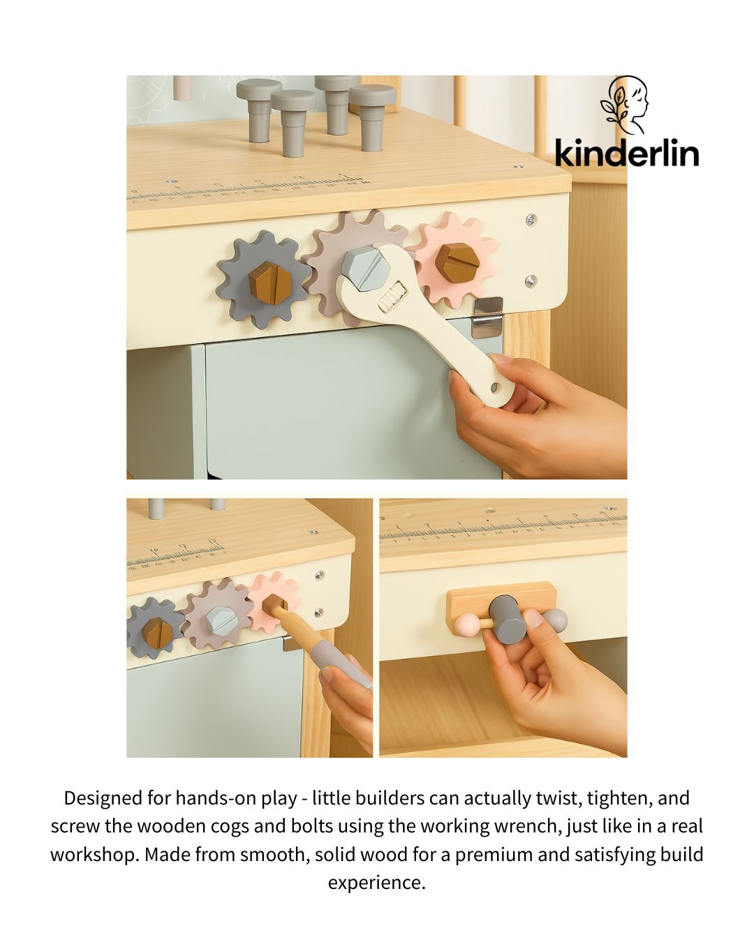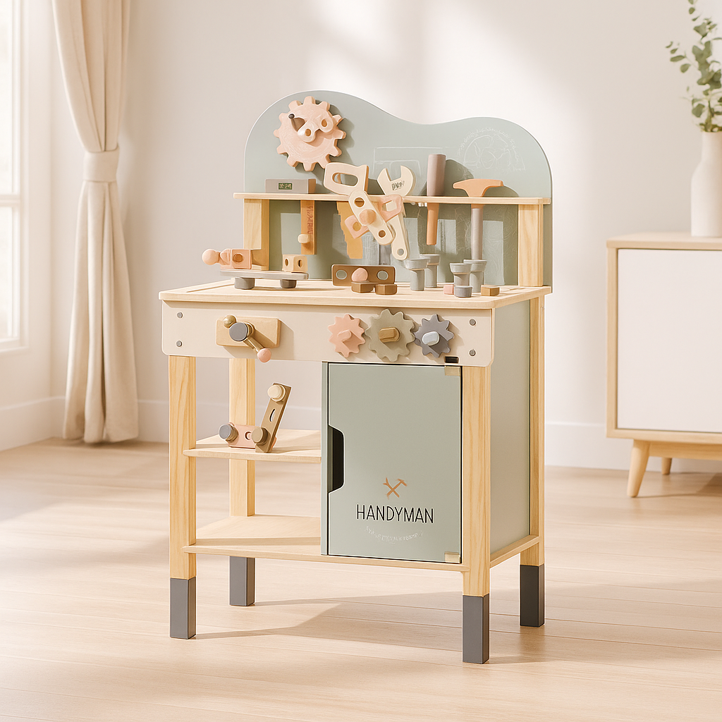 Built for little makers and big imaginations — The Builder’s Workshop is a complete wooden tool station made for hands-on play. It comes with everything your young builder needs: tools, screws, bolts, and turning cogs — all made from smooth, solid wood for safe and realistic construction fun.